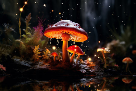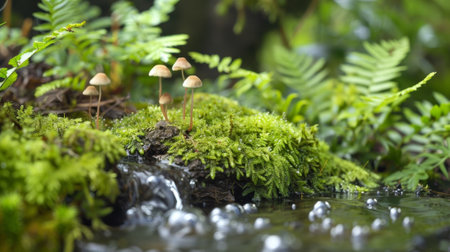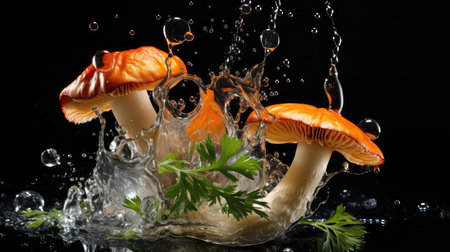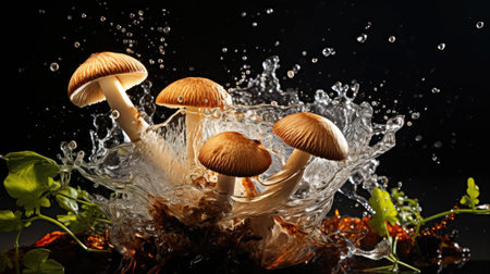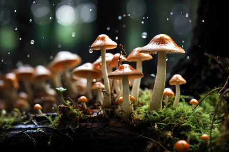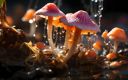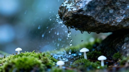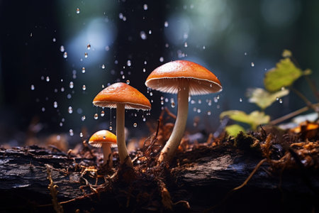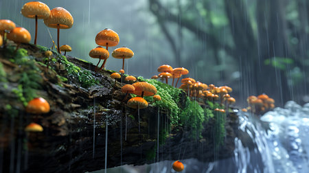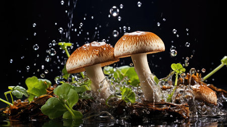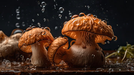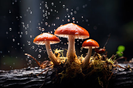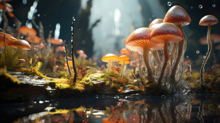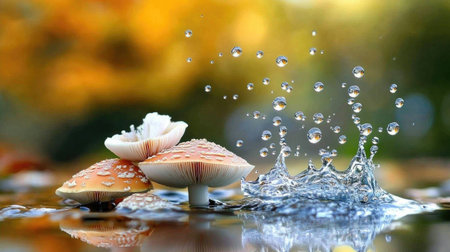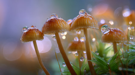 Captivating view of mushrooms surrounded by water droplets, showcasing nature's beauty with vibrant colors and serene ambiance in a tranquil environment.