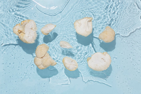 Minimal fungiculture concept. Lion's mane floating in water. Pastel blue background with splashes and shadows. Edible medicinal mushrooms hericium erinaceus. Summer food top view.