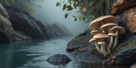 AI Generated. Mushrooms Growing in Rocky Crevices Beside Water