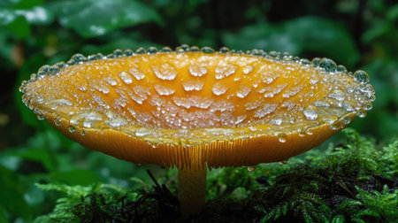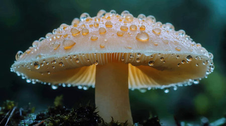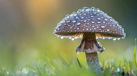 A stunning close-up of a mushroom adorned with glistening dew droplets, captured in soft morning light. This serene scene showcases the beauty of nature.