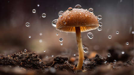 A stunning close-up of a brown mushroom displaying raindrops on its cap, set against rich, dark soil, showcasing the serene beauty of nature in a vibrant ecosystem.