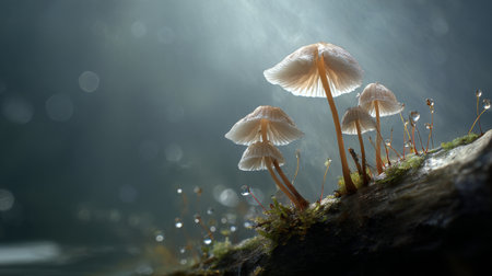 An artistic composition of mushrooms growing in a misty environment, with water droplets hanging from their caps, creating a magical, ethereal atmosphere