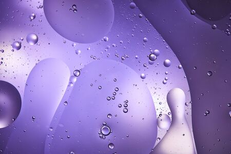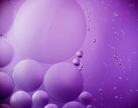 Colorful violet blue bubbles, macro oil drops in water surface. Abstract background, copy space