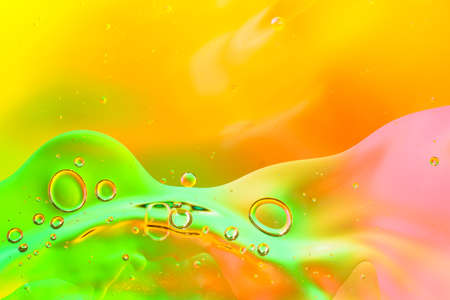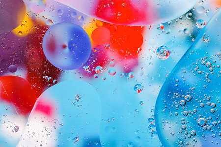 Top view movement of oil bubbles in the liquid. Oil surface multicolored background. Fantastic structure of colorful bubbles. Colorful artistic image of oil drop floating on the water
