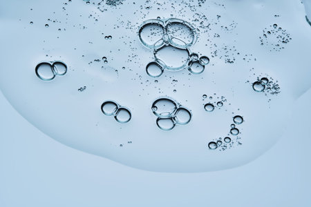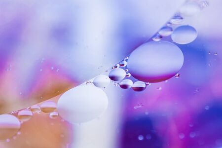 Lots organic oil bubbles on colored background. Concept of skin moisturizing. Oil and water bubbles macro photography.