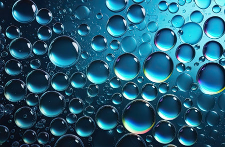 Abstract water bubbles light illumination background, macro art of water bubbles on water surface background display for your products and artwork design. Abstract glare on bubbles and watery background