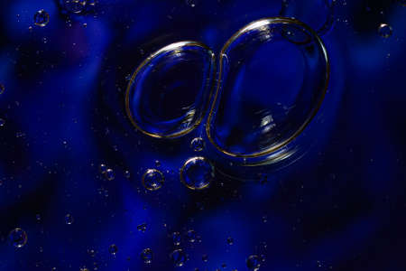 oil with bubbles on dark blue background. Abstract space background. Soft selective focus. macro of oil drops on water surface. copy space. air bubbles in water