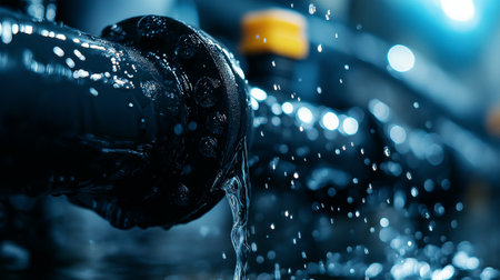 Close up of water gushing from a leaking pipe in an industrial setting, highlighting the concepts of water waste, industrial accidents, and plumbing issues