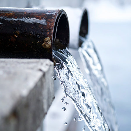 Close-up of water splashing from a corroded metal pipe, highlighting leaks and repair challenges in an industrial setting.