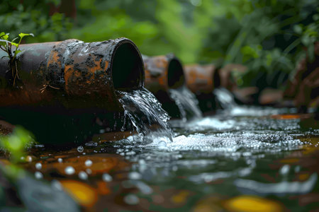 Water flowing from rusty pipes into a serene natural body of water. Concept of water pollution and environmental impact.