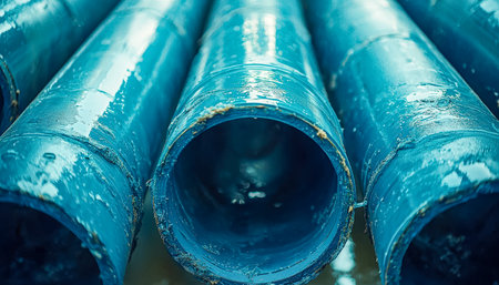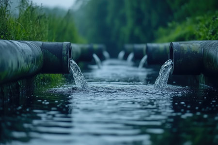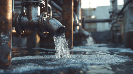 Close-up of factory pipes releasing contaminated water, symbolizing environmental degradation