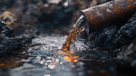 Close-up of dark fluid gushing from corroded metal pipes into a water body, symbolizing environmental impact.