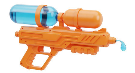 Bright showing orange water gun with blue water droplets keywords: water gun, toy, summer, fun, play, water fight, plastic, orange, blue, water, droplets, spray, liquid, outdoor, children, game, recreation, object, accessory, equipment, summer fun, beach, pool, vacation, holiday, childhood, action, bright, colorful, isolated description: a bright orange plastic water gun with a blue water reservoir on top. a stream of blue water is shown spraying from the nozzle. the water gun is depicted...