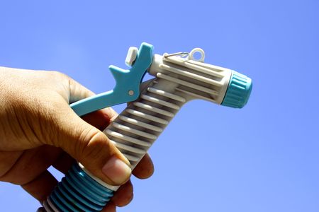 Hands holding plastic water gun ready to fight for Water or Songkran festival which celebrate in Thailand summer time on April with blue background.