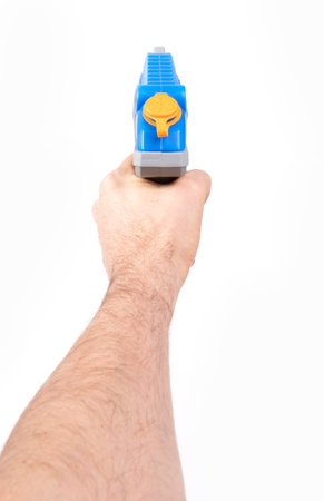 Hand hold big water guns for water spray the water party in The traditional Thai New Year Songkran, isolated on white white copy space.