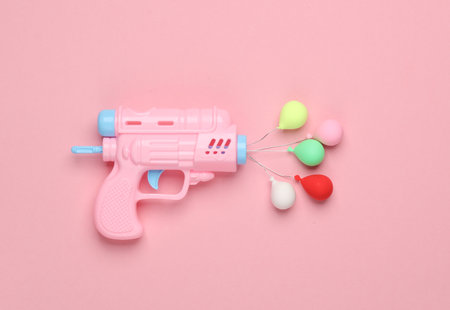 Plastic gun with balloons on pink background. birthday, holiday concept. Minimalism
