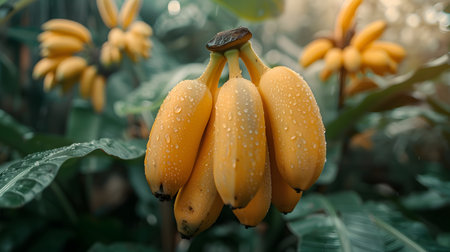 Bunch of yellow bananas with raindrops on the branches in a garden