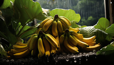 Mature banana tropical fruit in fresh green banana, generative AI