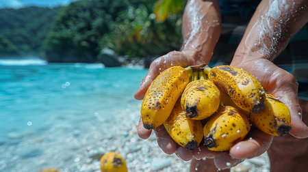 Close up of man hands holding fresh bananas on the tropical beach.