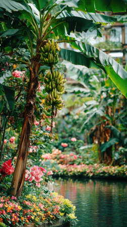 Banana tree in the garden. Tropical garden with flowers and plants.
