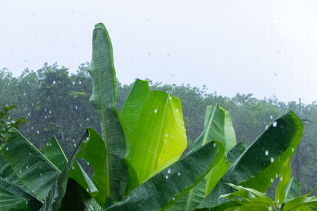 outdoor of fresh green banana tree on rainy day