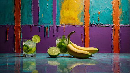 Two glasses of mojito with lime and banana on a colorful background