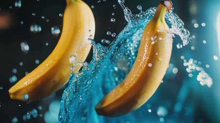 Two ripe bananas burst through water droplets, creating a dynamic and energetic scene perfect for showcasing the freshness and appeal of fruit in a vibrant setting.