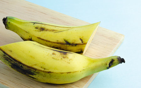 Ripe nigerian plantain on wood kitchen table surface