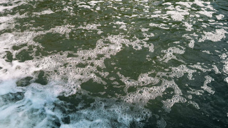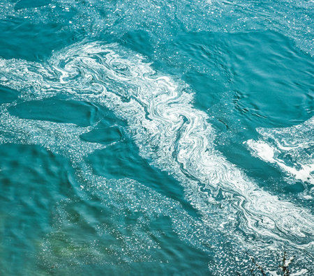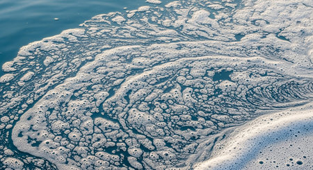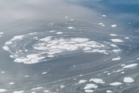 Foam and bubbles swirl in a murky waterway under a cloudy sky, revealing environmental concerns and water pollution.