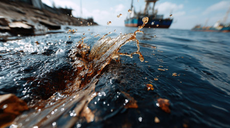 Ecological catastrophy. Close-up. Spill of oil products into the sea. Poisonous oil products float on the surface of the clean sea.
