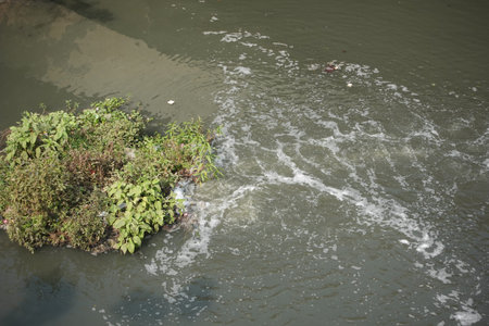 JAKARTA - Indonesia. September 18, 2019: Contaminated water with foam of detergents and plastic waste in the river