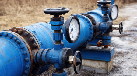 A detailed view of an industrial water pipe system featuring pressure gauges and valve controls, showcasing essential components for utility management and maintenance.