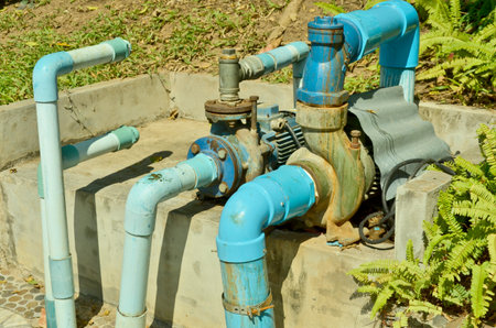 Water pump station. Electric pump connection to pvc pipe, valve control and pressure tank. Cover by chain link. Machine equipment for water flow, utility and plumbing system.