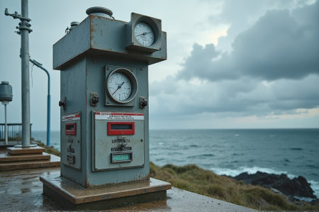 Coastal weather station with instruments and ocean view on cloudy day. That the image is generated using AI.