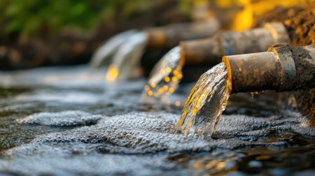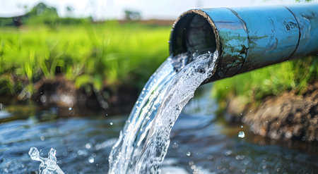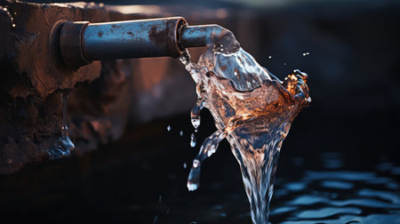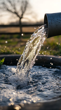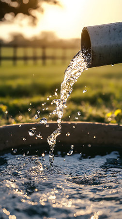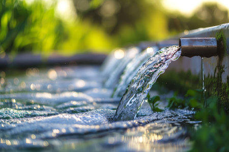 The image captures water flowing from a pipe in a natural setting, showcasing the beauty of liquid movement under sunlight, emphasizing the importance of water in nature.