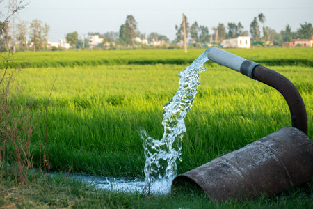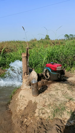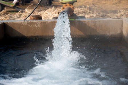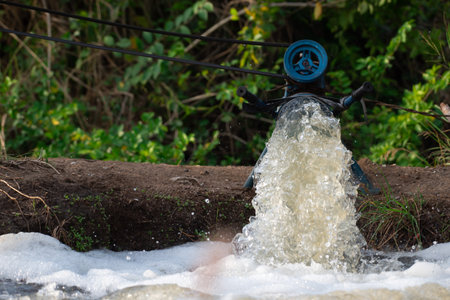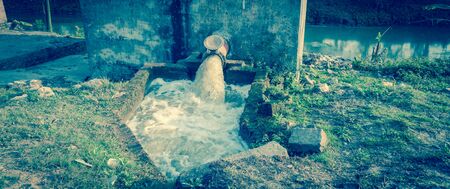 Panoramic Asian irrigation pumping system with bubbles flowing on water running from a rustic pipeline in Vietnam