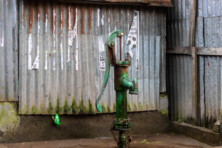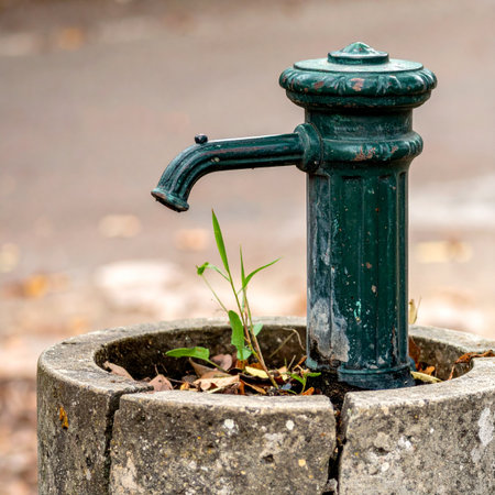 A weathered green cast-iron water pump stands as a relic of a simpler time. Set in a rustic stone base, its peeling paint tells a story of years of service, while a resilient green sprout at its feet symbolizes the persistence of life and nature.