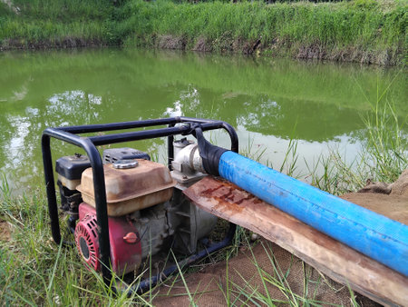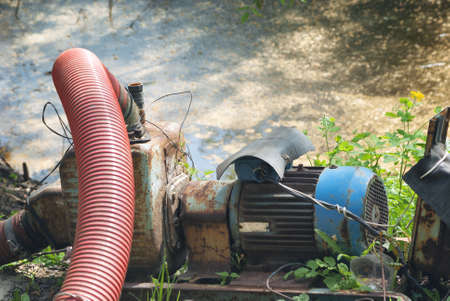 Old pump with a thick red fire hose is drying swamp. Pumping water from the pond.