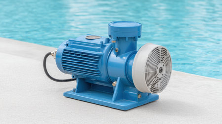 A bright blue water pump sits beside a sparkling swimming pool, designed for efficient water circulation and maintenance on sunny days for clear and hygienic water.
