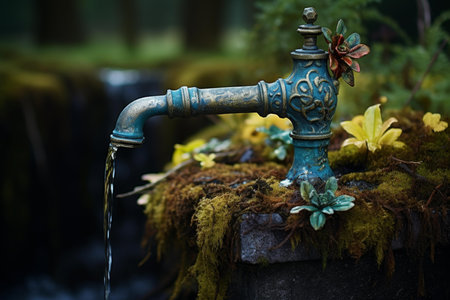 Old-fashioned bronze faucet with water streaming, surrounded by lush greenery