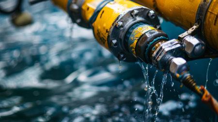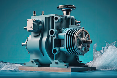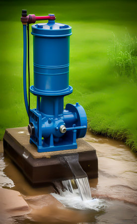 A powerful water pump expels a high-pressure stream of water, showcasing dynamic motion and engineering efficiency in an industrial setting. The image captures the energy and force of water in action.