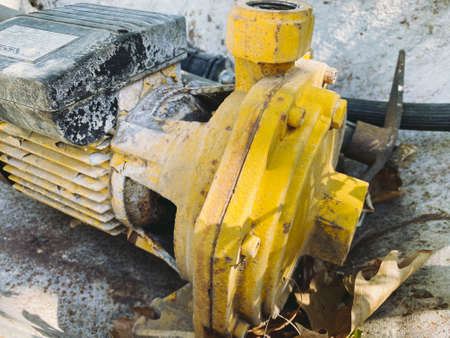 Yellow water pump on the ground in a building under construction. Selective focus.