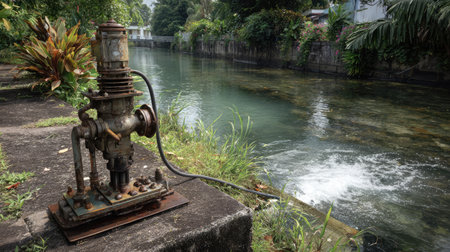 A rustic vintage water pump stands beside a peaceful riverbank, surrounded by lush greenery and calm water, embodying a sense of tranquility and history.