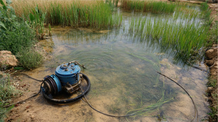 A serene agricultural scene featuring a pump in shallow water, surrounded by lush green crops and vibrant vegetation, showcasing rural farming practices.