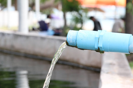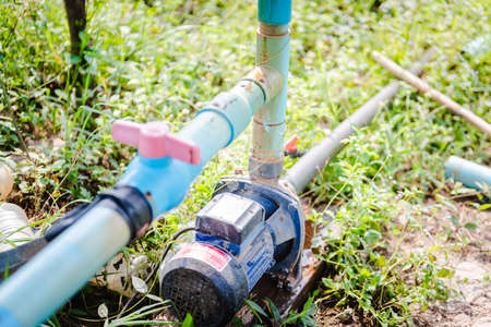 bright lighting. equipped well under water. Their PVC pipe is blue. Close-up.