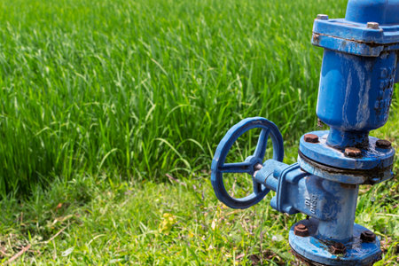 A blue irrigation valve with rusted bolts and water drops stands in a lush green field, symbolizing water supply and agricultural irrigation.