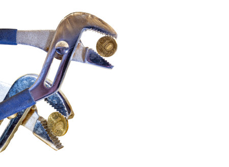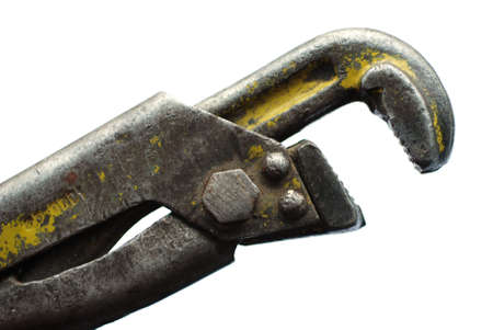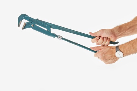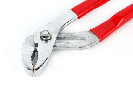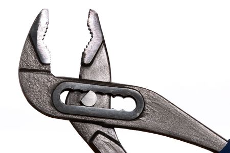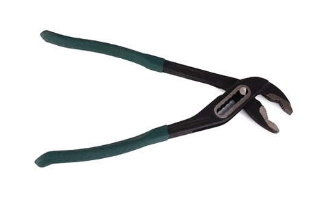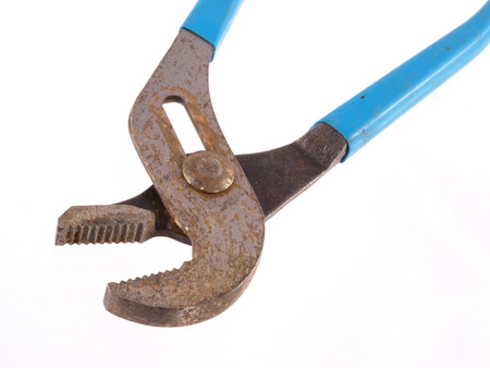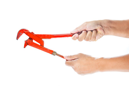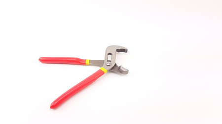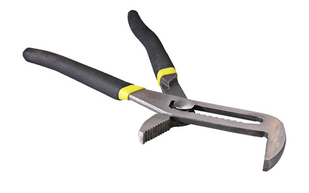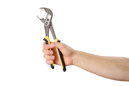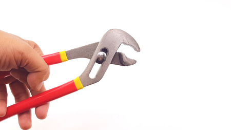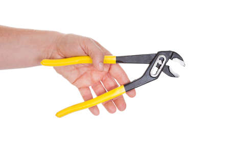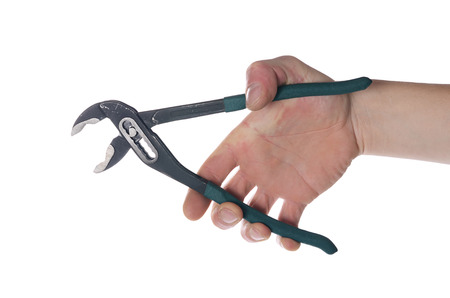 Hand holds adjustable pliers to repair something. Isolated object on white. Do it yourself