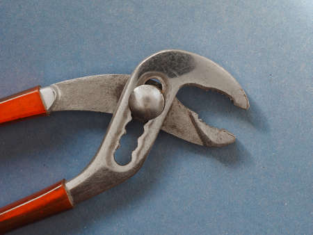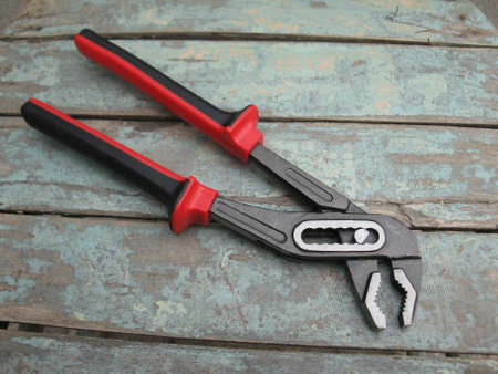Adjustable plumbing wrench with blue handles. Joiner's hand tool