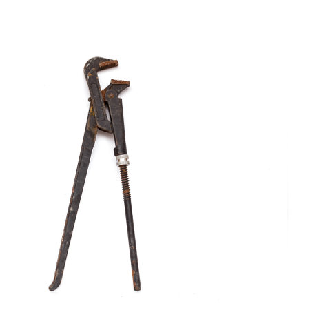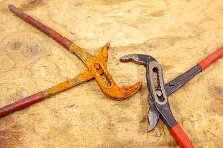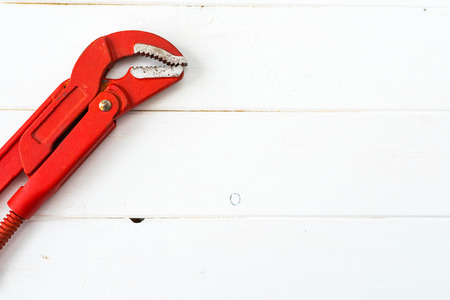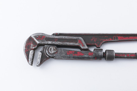 An old beat-up plumber’s wrench which has its red paint partially peeled off