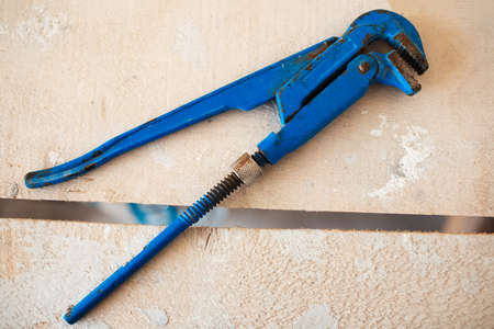 Close-up of adjustable gas wrenches of blue color on wooden table.